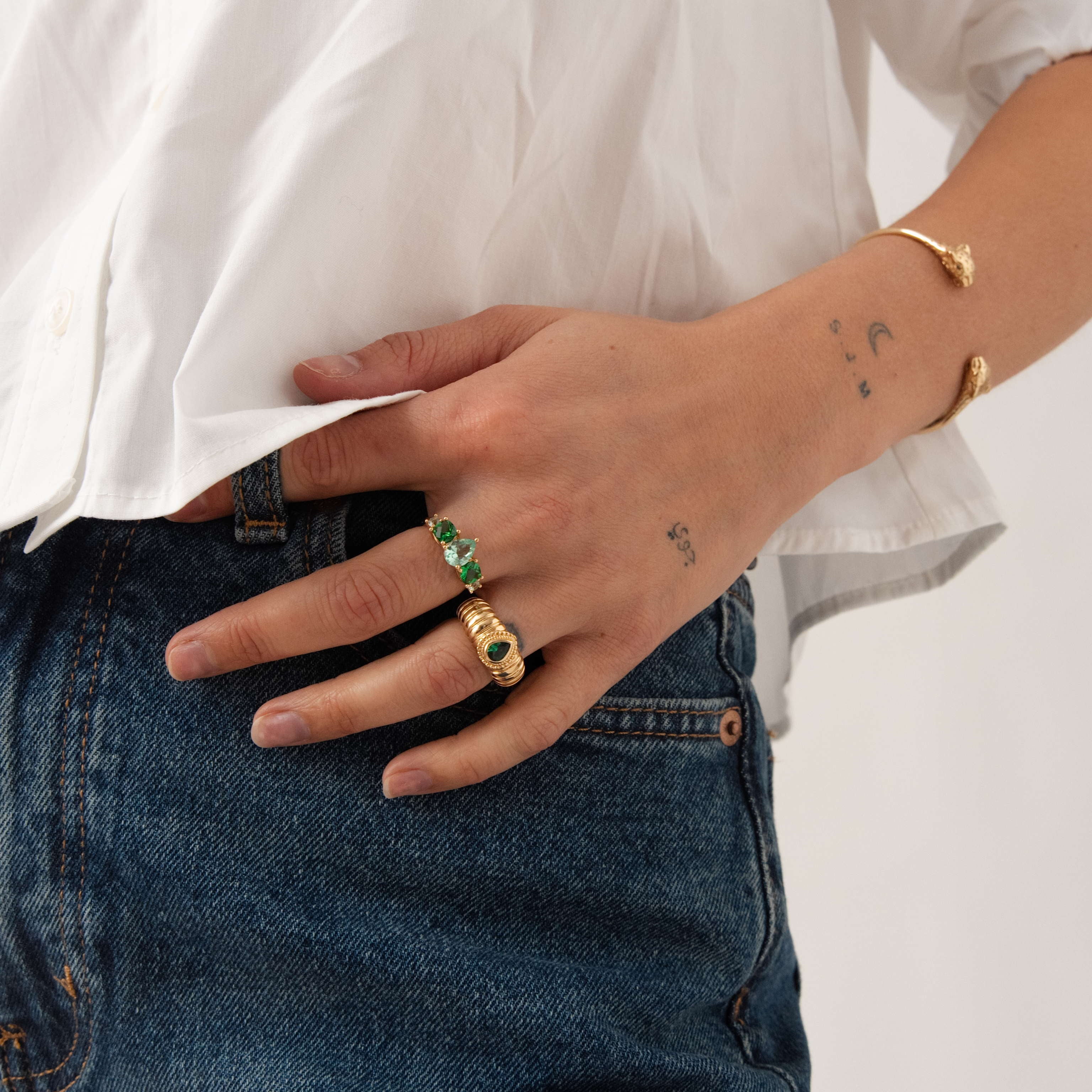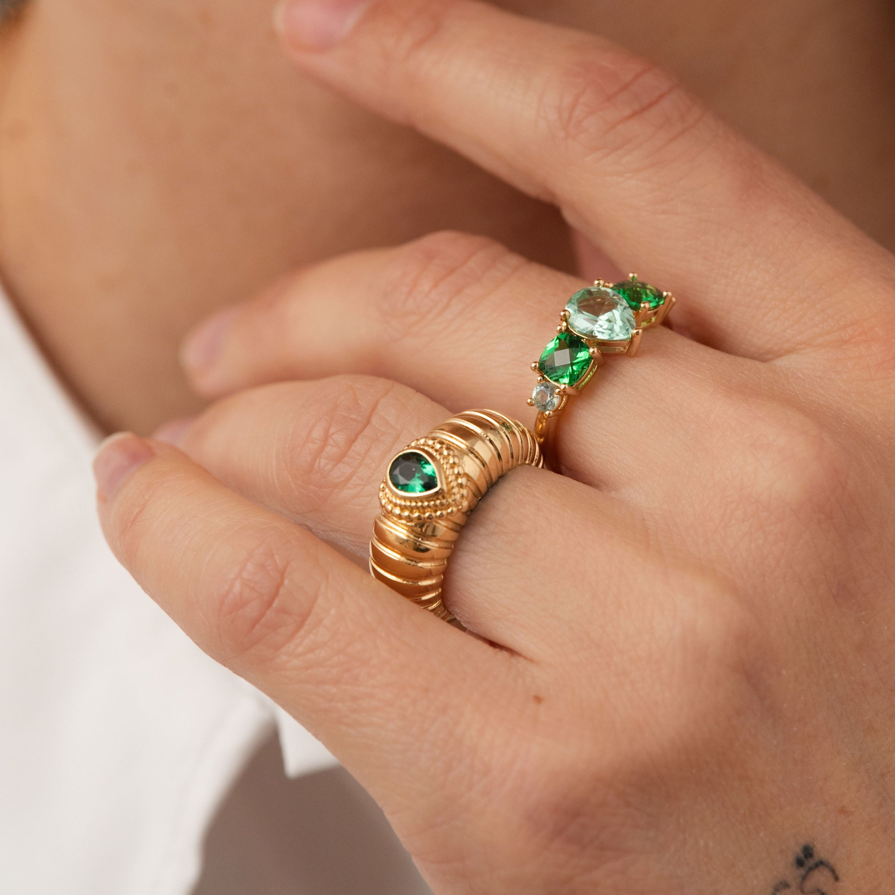 La bague Astrid revisite l’esprit vintage avec élégance. Sa monture nervurée en plaqué or 18 carats encadre une pierre en zirconium vert, entourée d’un délicat travail de perlage.