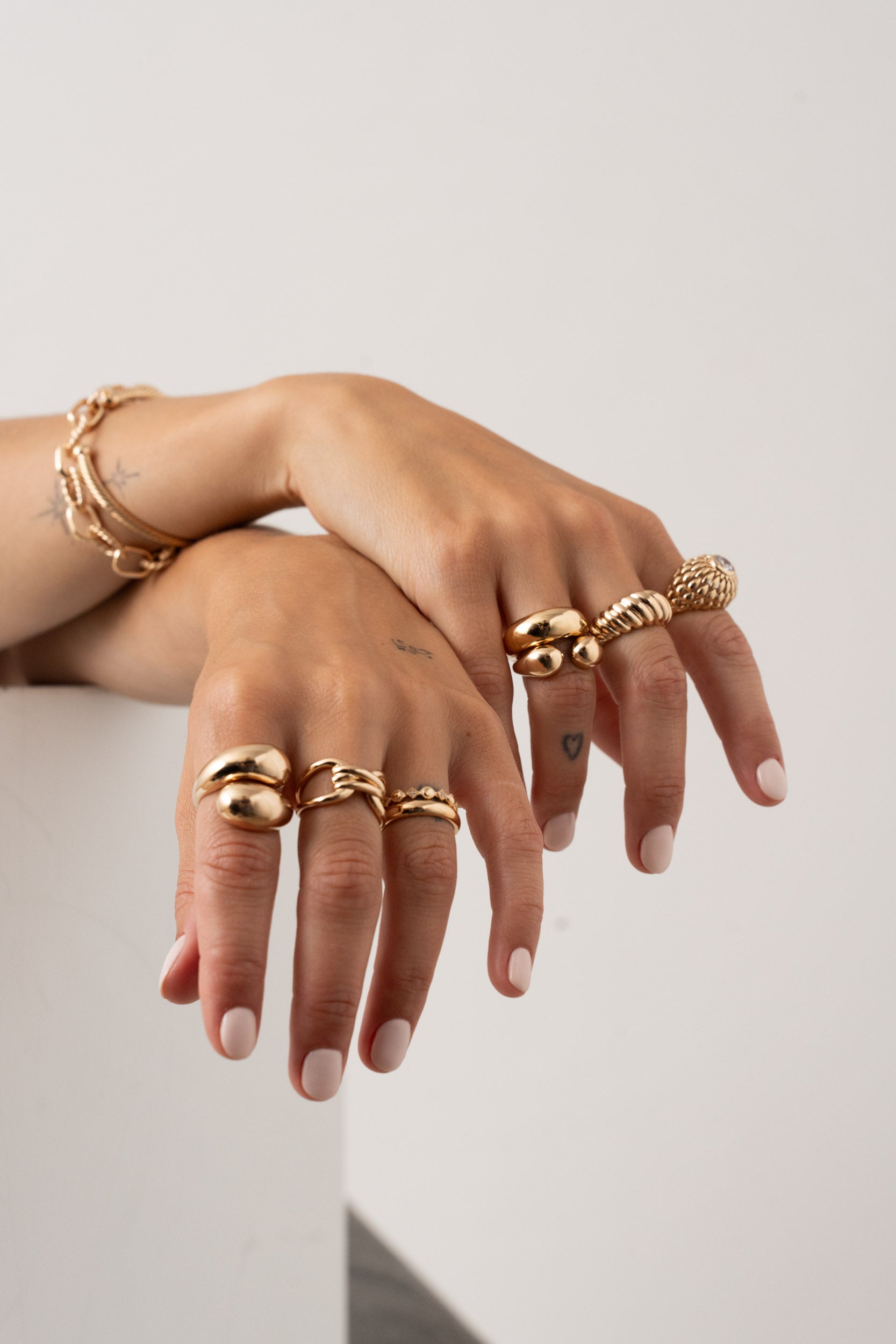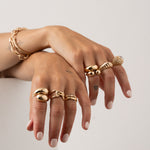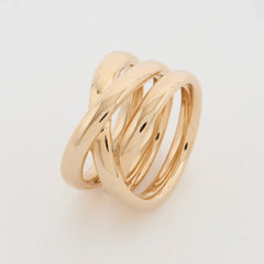 La bague Aliénor en plaqué or 18 carats se distingue par son design noué original. Les anneaux s'entrelacent de part et d'autre pour former un noeud sur le dessus.