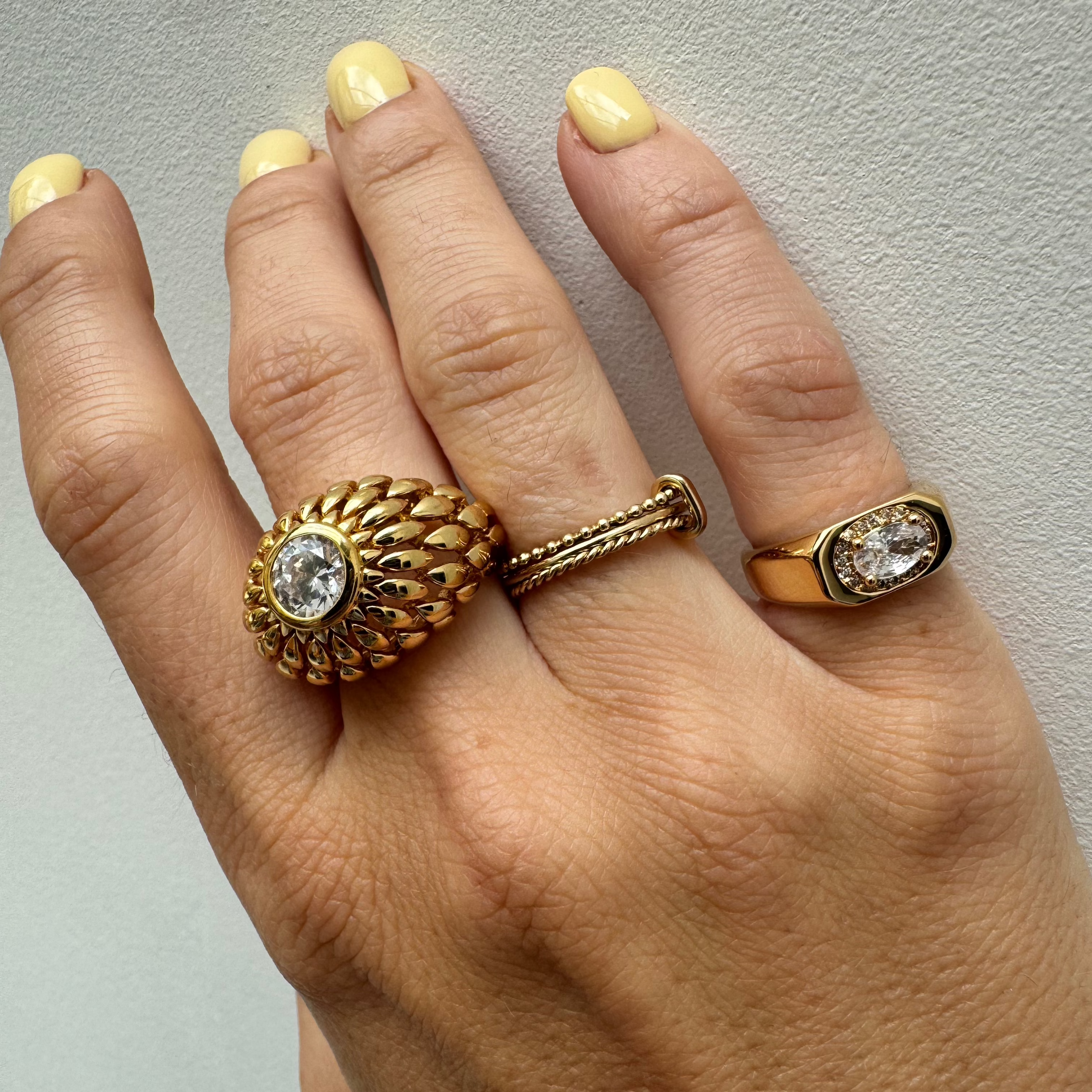 La bague Alix en plaqué or 18 carats est sertie d'un gros zirconiums et plusieurs petits zircons. Elle a un look à la fois vintage et moderne.