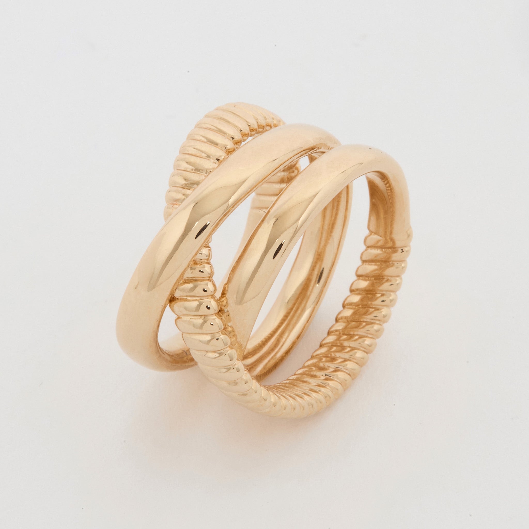 La bague Ambre en plaqué or 18 carats présente trois anneaux entrelacés dont deux à la texture lisse et polie et un texturé. Ce modèle existe aussi sans anneau texturé (bague Emma).