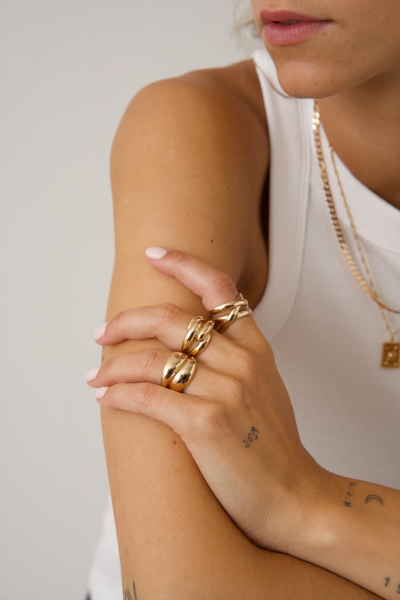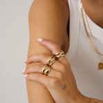 La bague Emma en plaqué or 18 carats présente trois anneaux entrelacés à la texture lisse et polie. Ce modèle existe aussi avec un des 3 anneaux texturé (bague Ambre).
