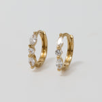 Les boucles Elin en plaqué or 18 carats sont des mini-créoles ornées de trois zircons en taille marquise et ronde. Un design élégant, discret et lumineux, idéal au quotidien. Existent en vert, voir Lysa.