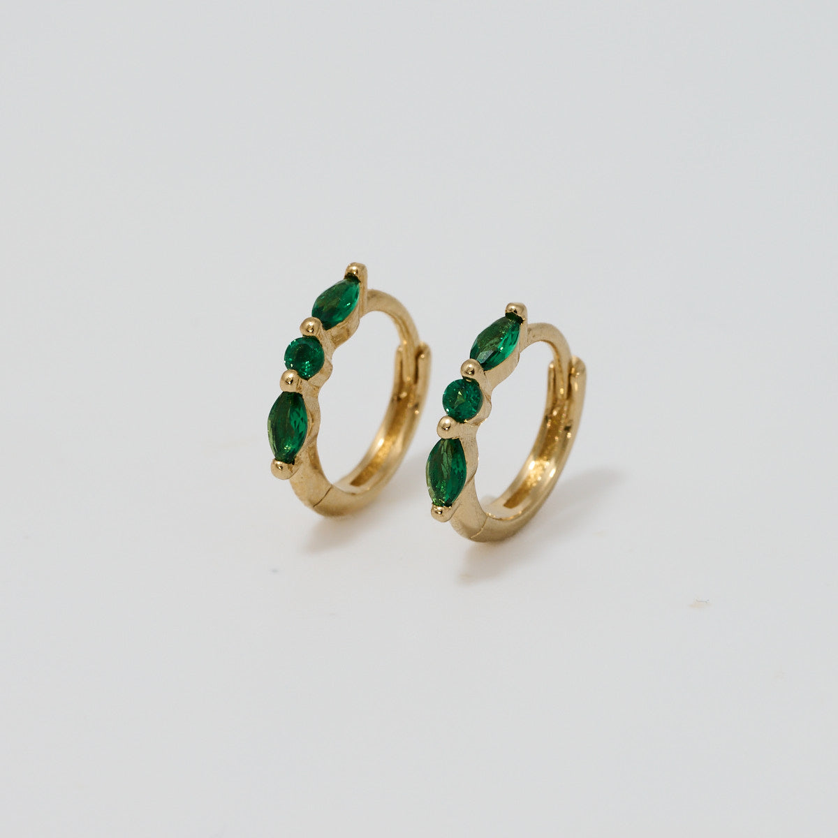 Les boucles Lysa en plaqué or 18 carats sont des mini-créoles ornées de trois zircons vert bouteille en taille marquise et ronde. Un design élégant, discret et lumineux, idéal au quotidien. Existent en transparent, voir Elin.