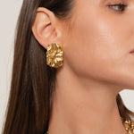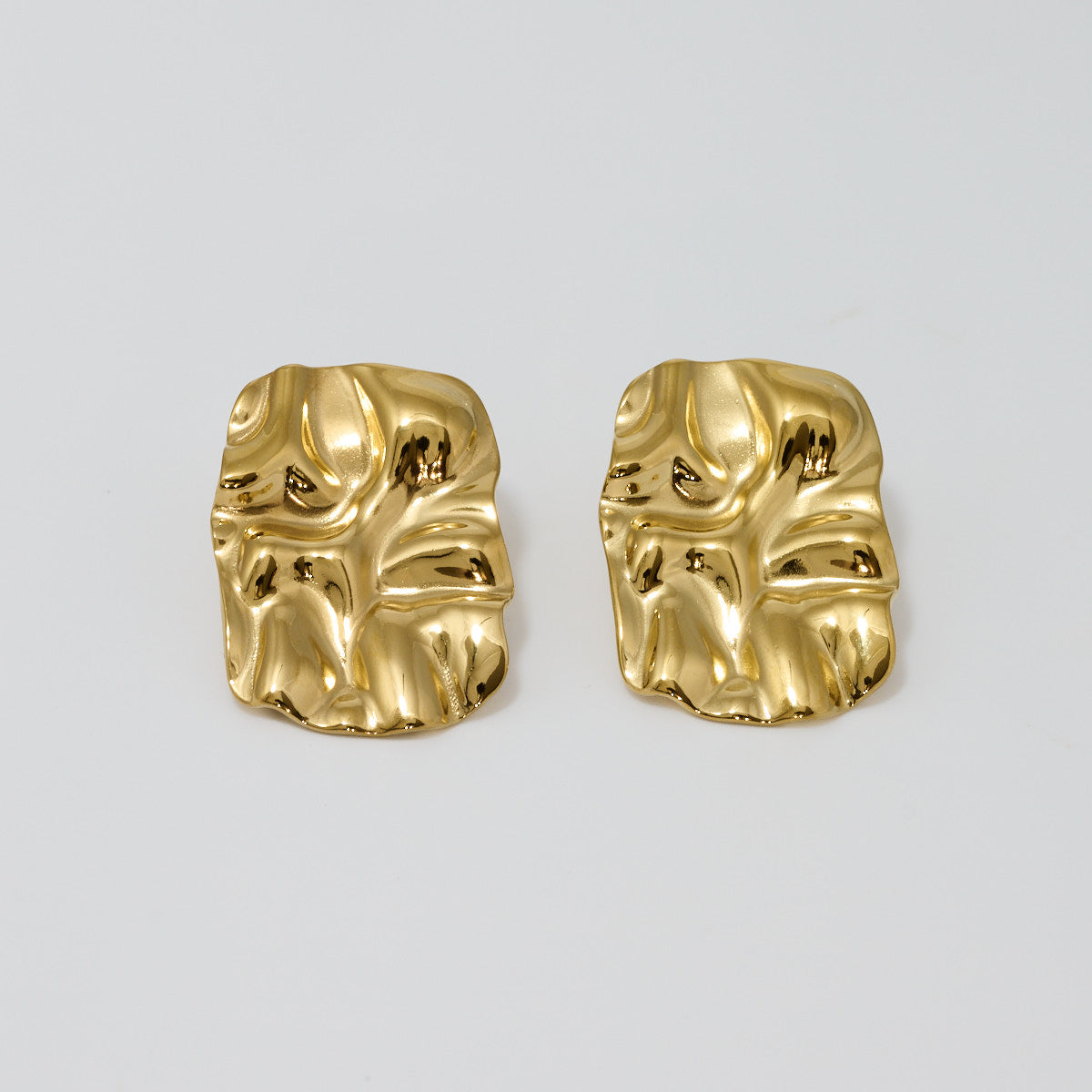 Un bijou texturé au look unique. Ces boucles d’oreilles larges affichent une surface plissée qui reflète la lumière de façon dynamique. Confectionnées en acier inoxydable doré, elles allient style et durabilité. Idéales pour un mariage ou cérémonie.