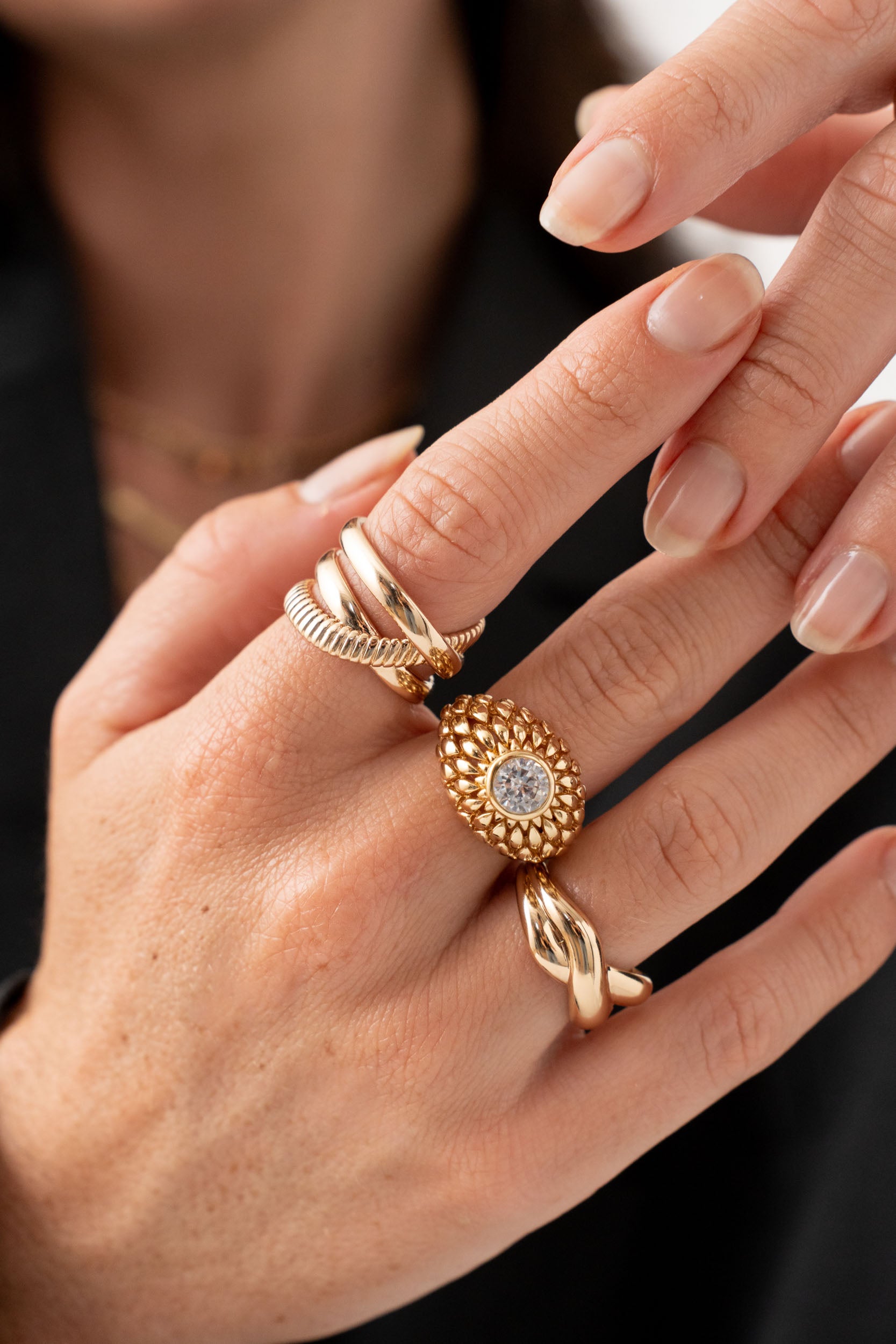 La bague Daria en plaqué or 18 carats est bombée avec un zirconium au centre. Cette bague se distingue par sa structure ajourée en forme de pétales. Vous pouvez la porter seule pour effet sophistiqué ou bien vous pouvez la combiner avec des bijoux plus sobres pour un équilibre parfait. Elle peut également se porter à la manière d'une chevalière.