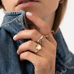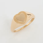 La bague Romi en plaqué or 18 carats représente un coeur en relief aux côtés texturés à la manière. Cette bague se porte seule, en accumulation ou à la manière d'une chevalière.