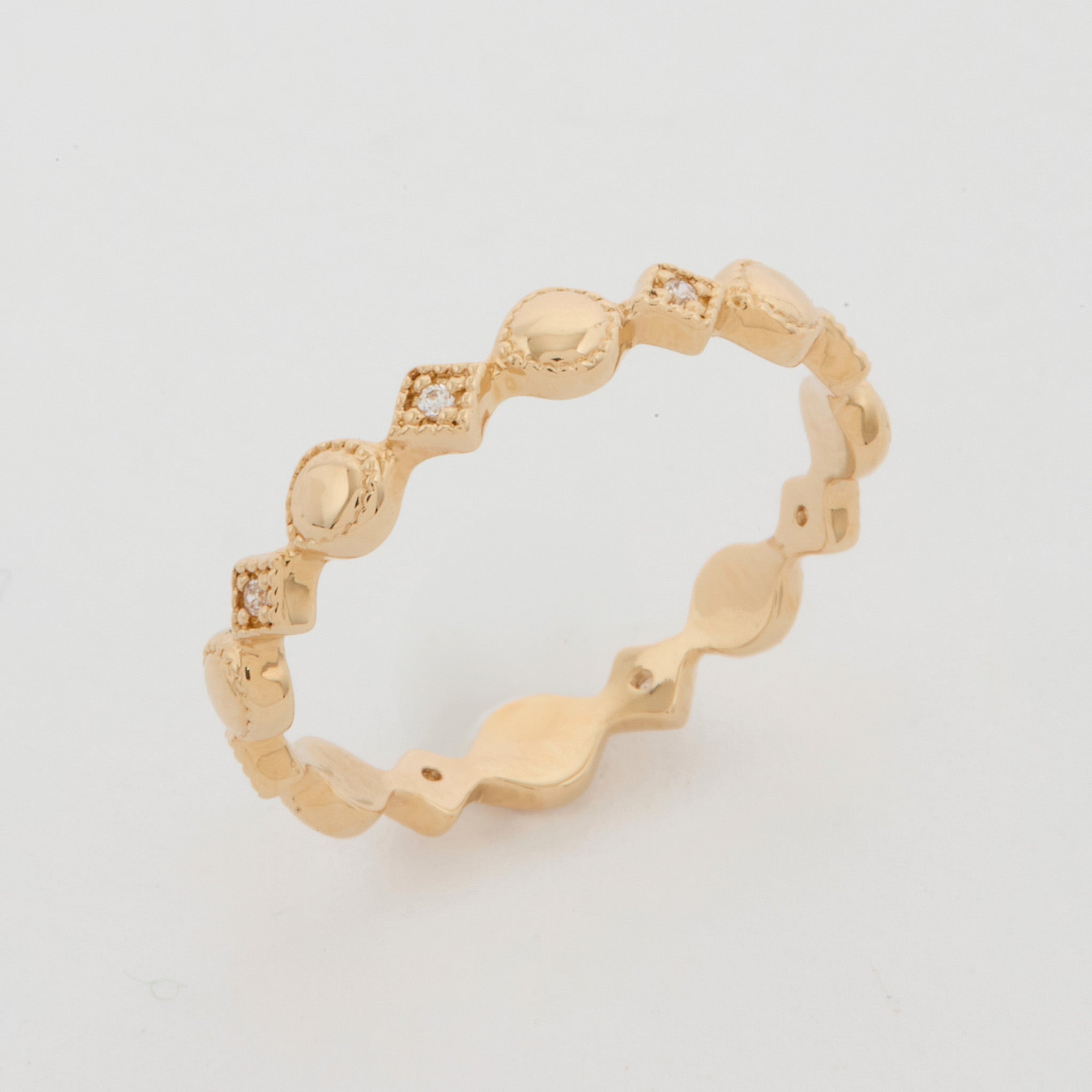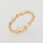 La bague Emy en plaqué or 18 carats est un anneau fin composé de motifs alternés ronds polies plats et de losanges serties d'un zirconium. Cette bague allie élégance et subtilité grâce à son design géométrique et ses petits zircons scintillants. Elle est parfaite pour réaliser des accumulations de bagues.