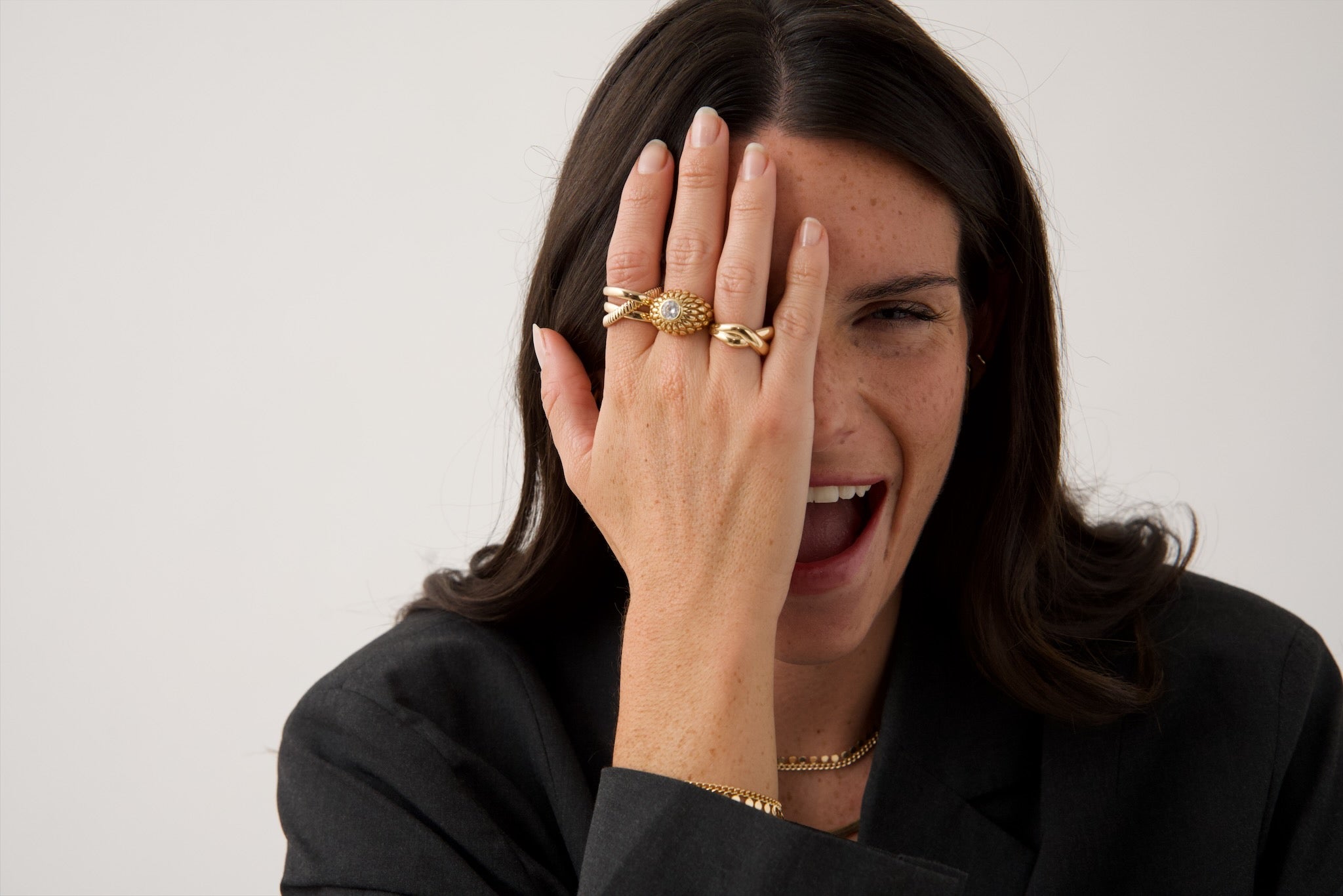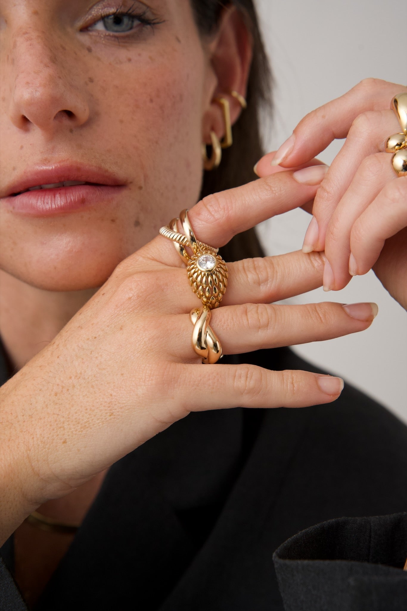 Un juste équilibre entre élégance et originalité, c'est la bague Manue en plaqué or 18 carats au design tressés. La bague présente deux anneaux qui s'entrelacent et une finition polie lisse et brillante.