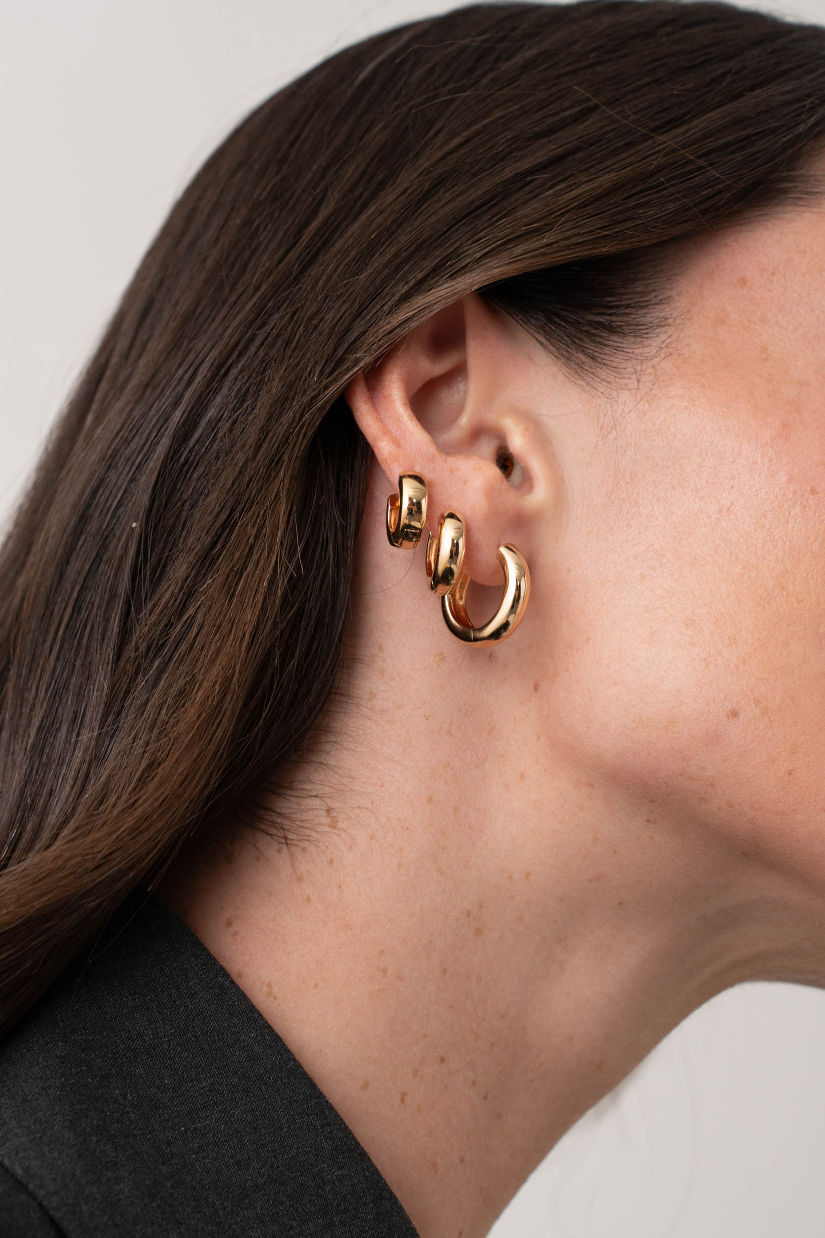 Les boucles d'oreilles Dora en plaqué or 18 carats sont des créoles simples et épaisses. Sa structure creuse les rend légères et faciles à porter. On adore les porter en accumulation avec les créoles Joy et Marlène.
