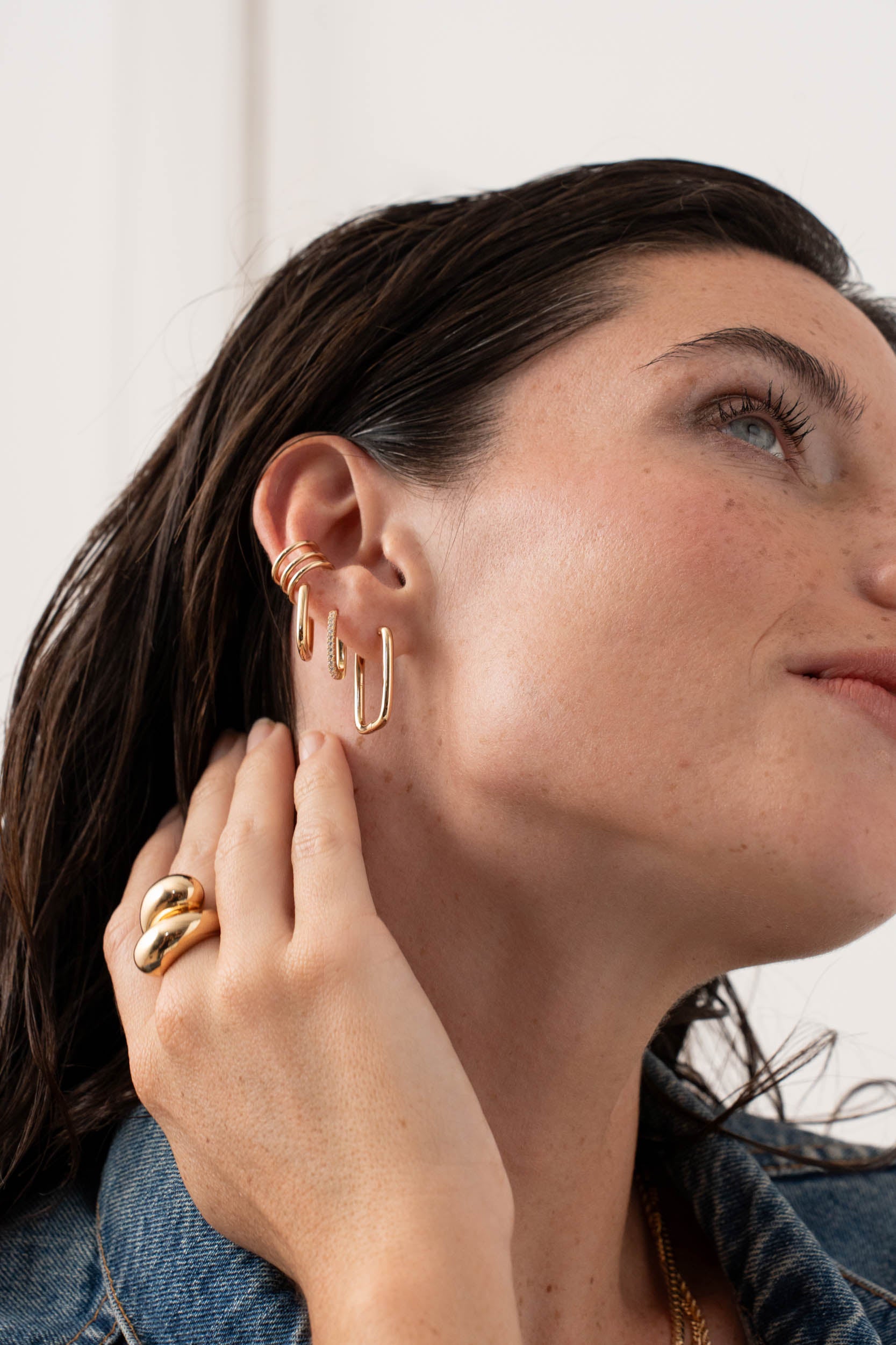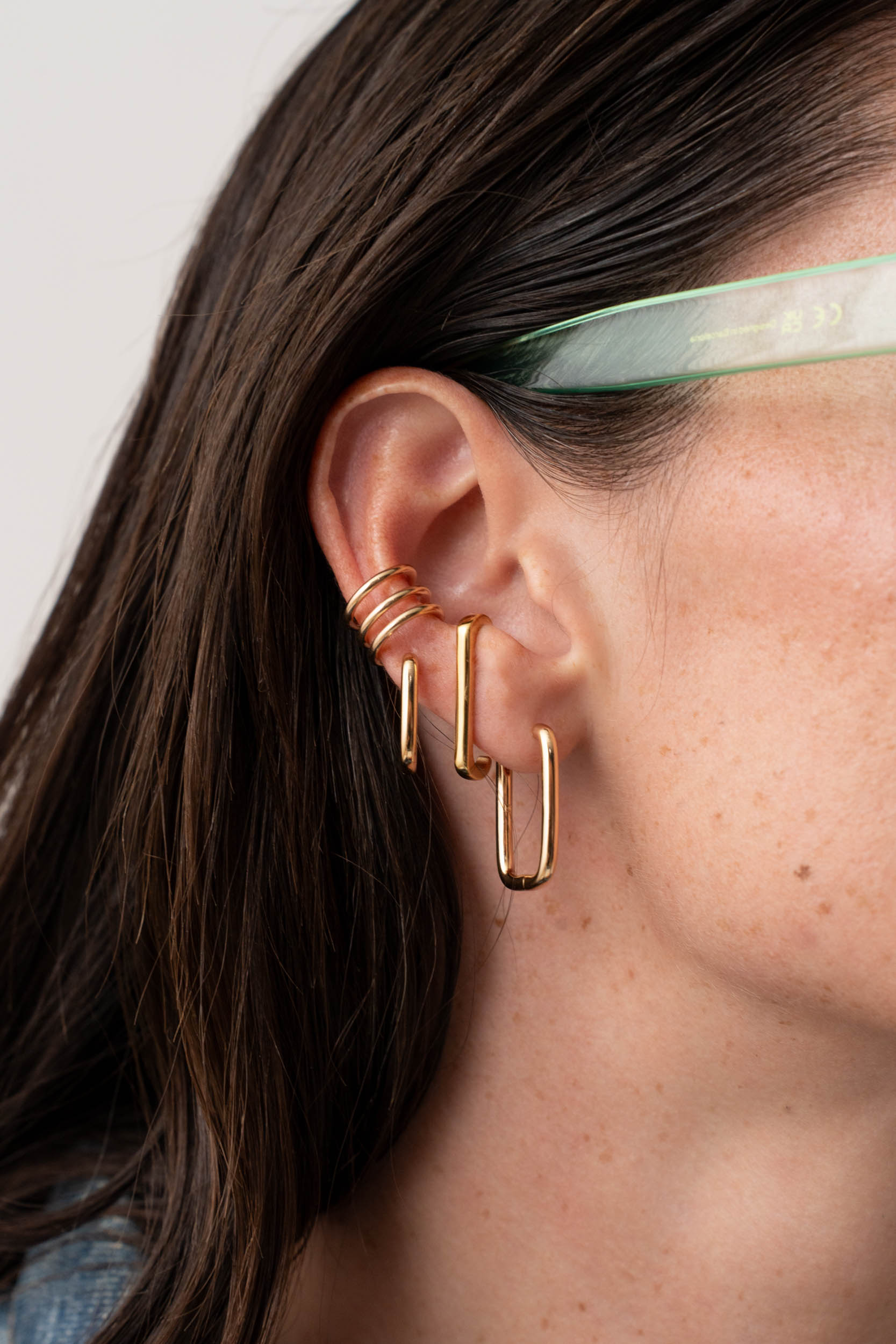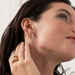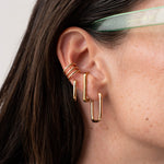Les boucles d'oreilles Lila en plaqué or 18 carats sont des créoles serties de zirconiums non teintés et ornées de pendentifs géométriques suspendus. Elles sont légères et faciles à porter pour diverses occasions. On conseille de les porter en accumulation avec les créoles Mia, Suzanne, Louise.