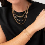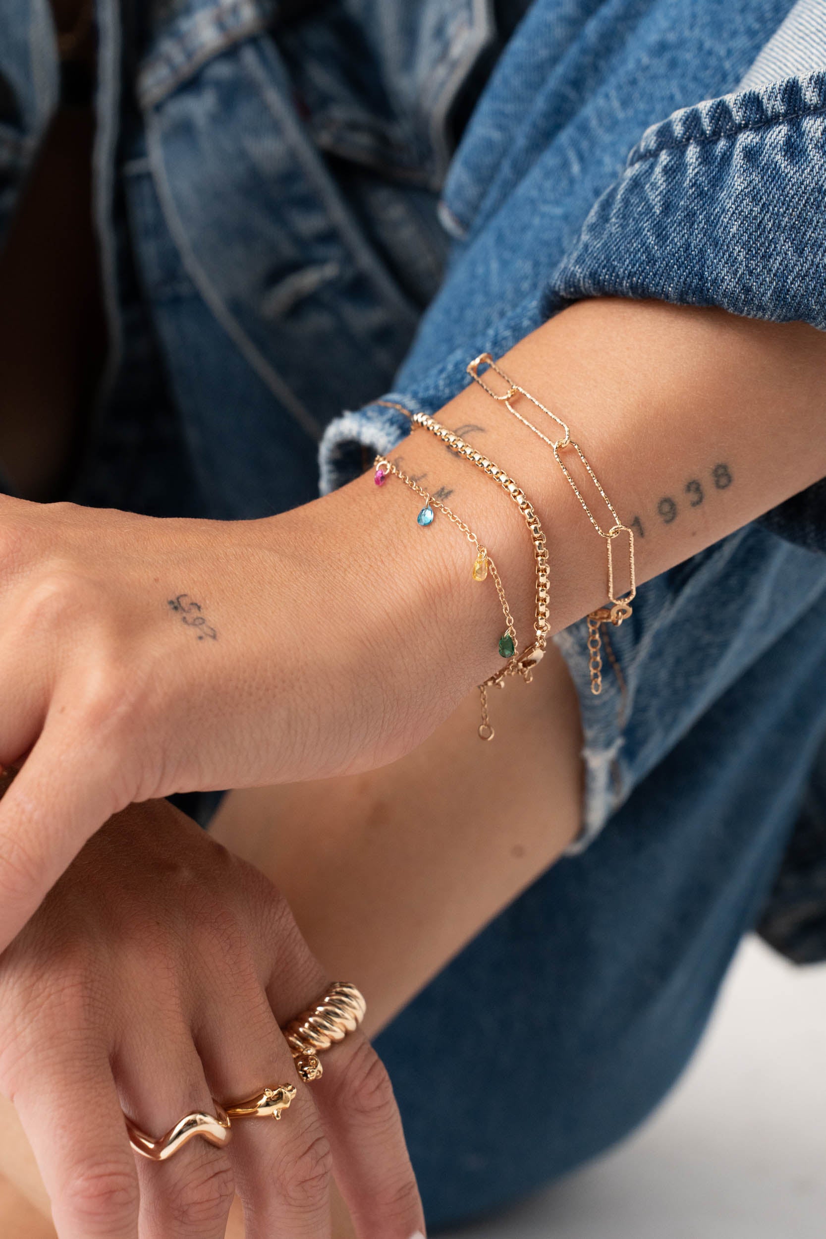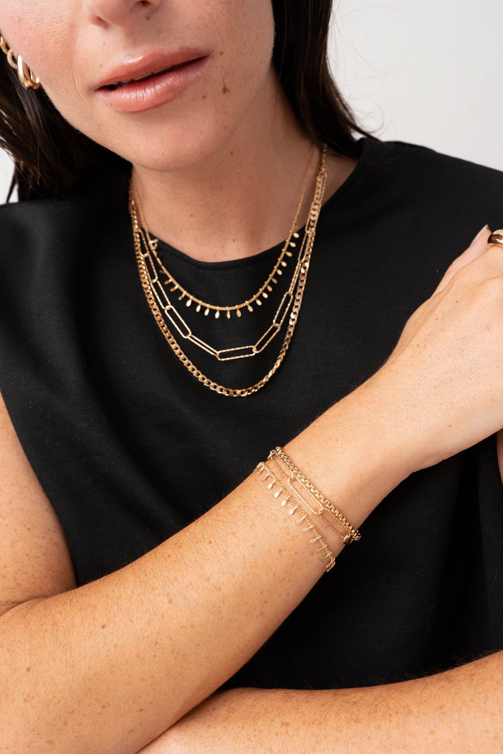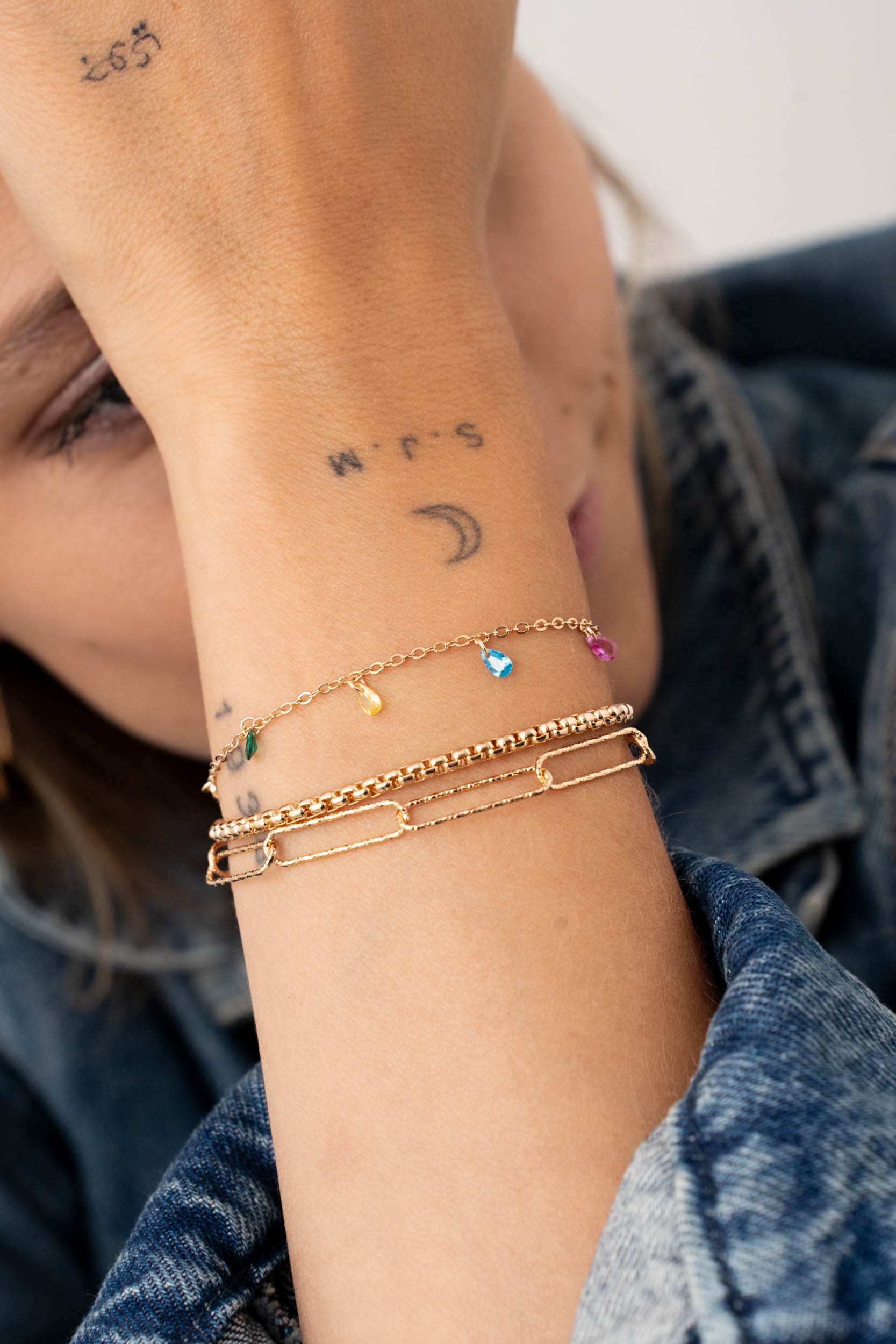 Le bracelet Adèle en plaqué or 18 carats se distingue par son design minimaliste composé de maillons rectangulaires texturés et brillants. Il est léger et possède un fermoir mousqueton avec une chaine qui le rend ajustable. Il convient à différentes tailles de poignet.
