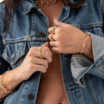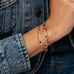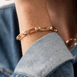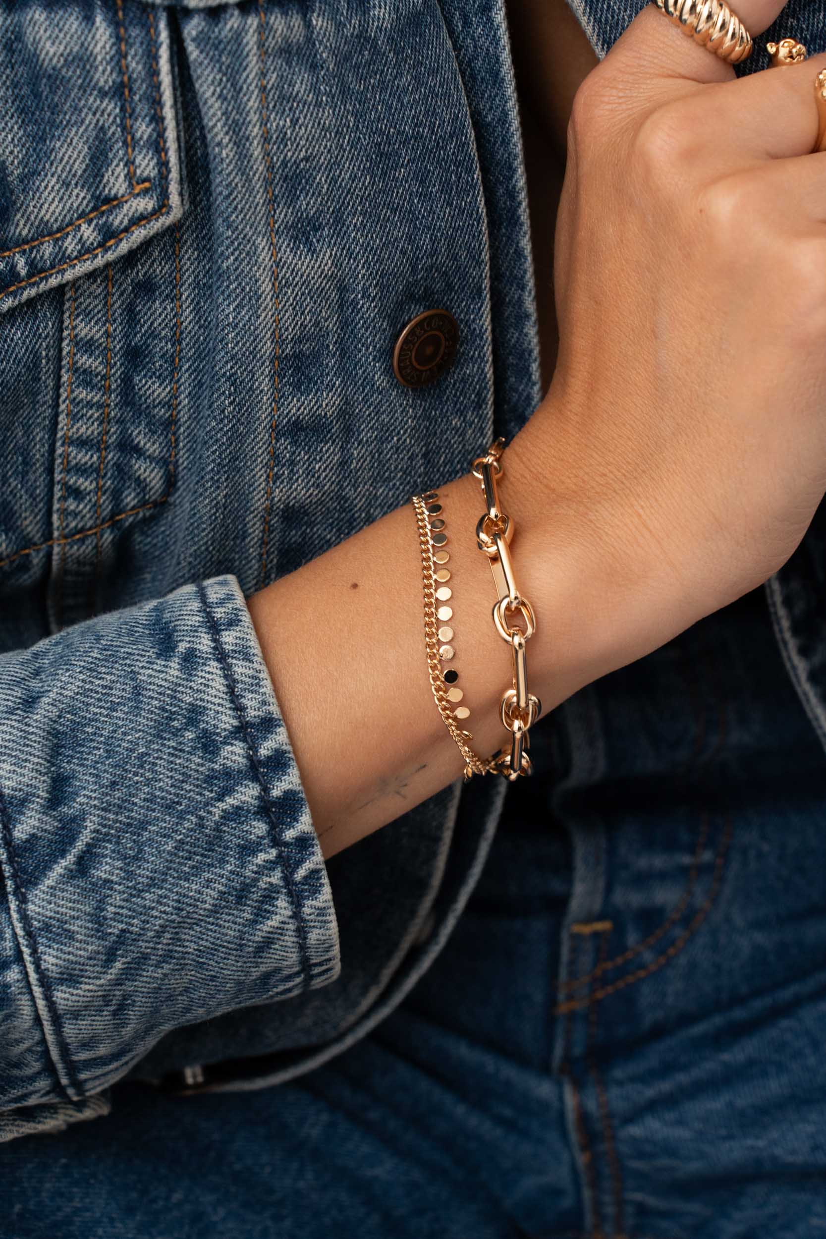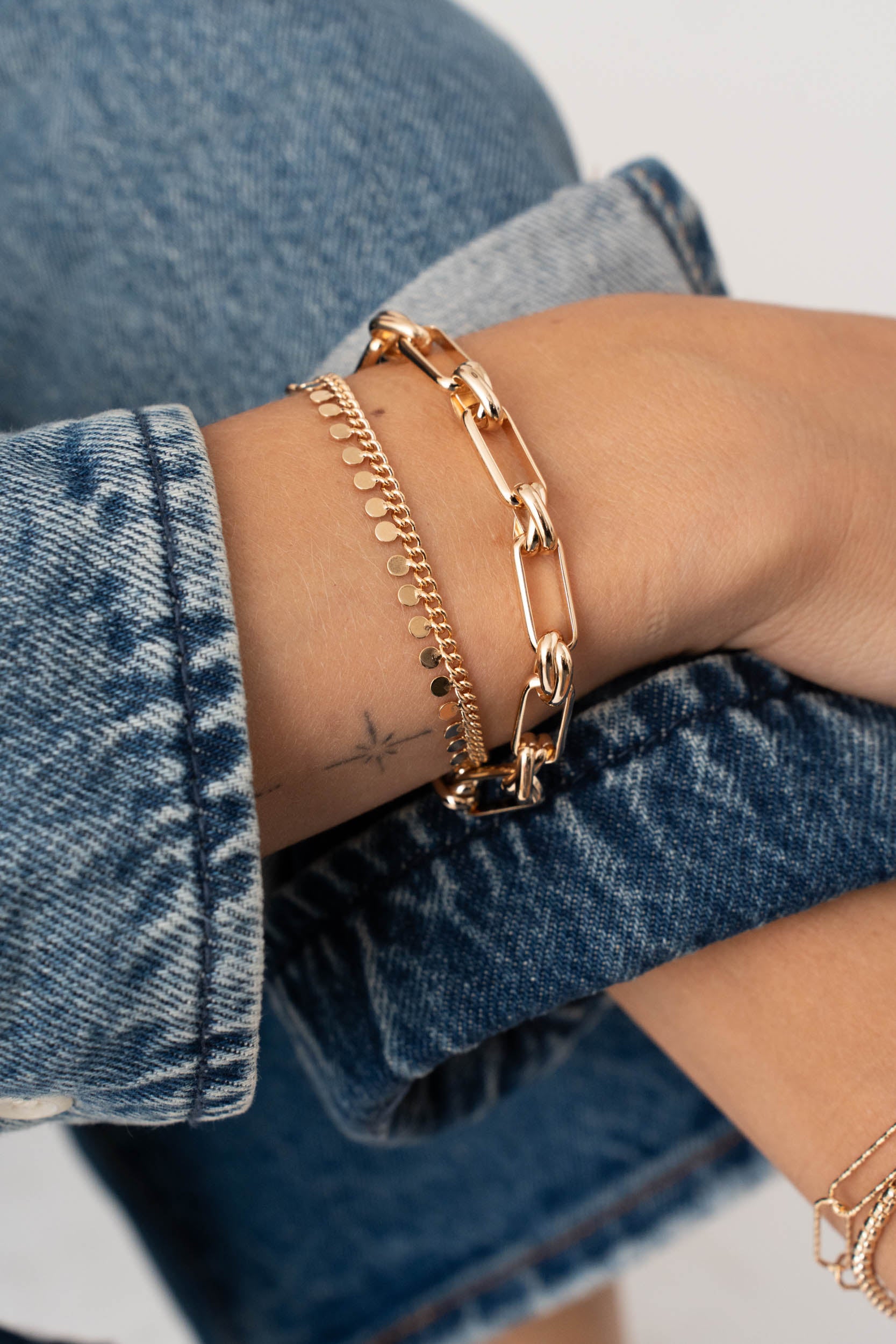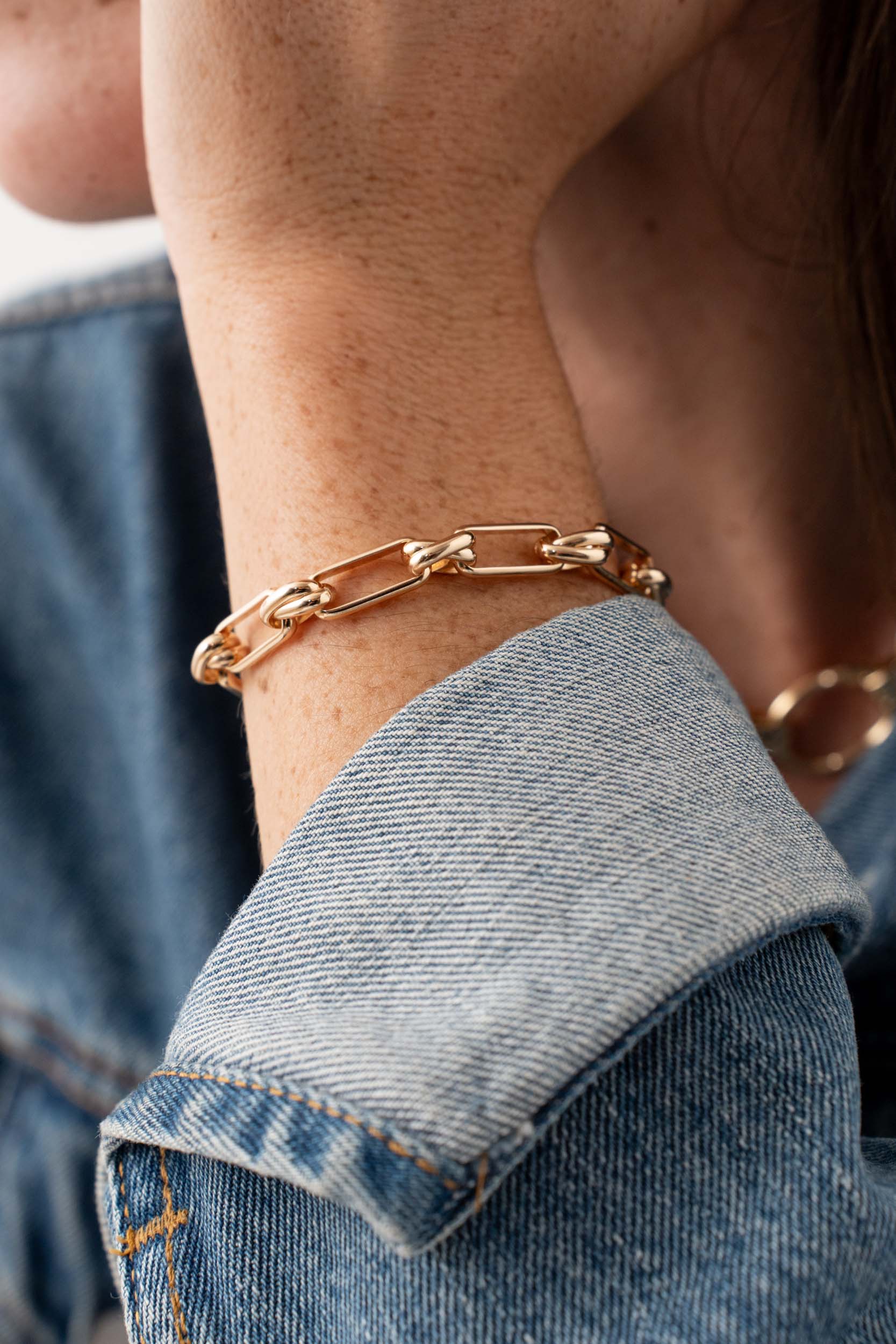 Le bracelet Théo en plaqué or 18 carats arbore un design moderne grâce à ses maillons géométriques rectangulaires et ovales. Doté d’un mousqueton et d'une chaîne ajustable, il convient à tous les poignets et peut être porté seul ou combiné avec d’autres bracelets pour un look superposé tendance.