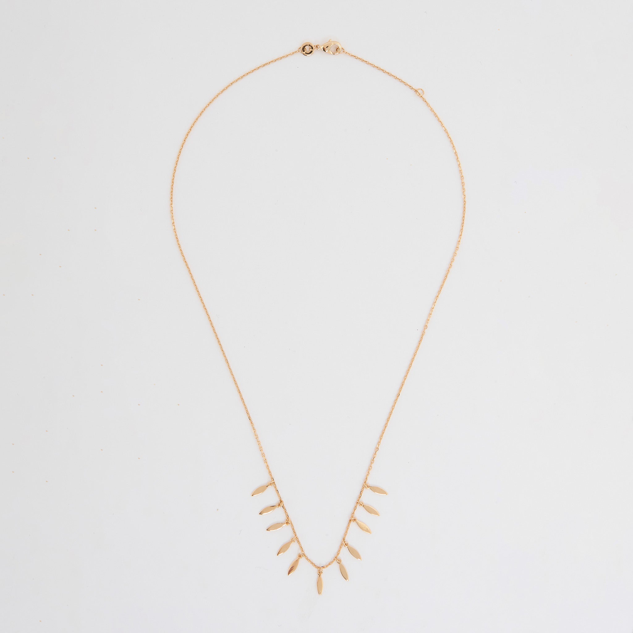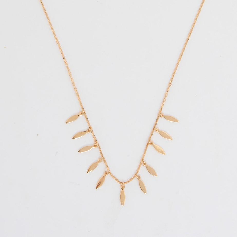 Le collier Maurice en plaqué or 18 carats est une chaîne avec des pampilles plates et pointues en forme de feuilles et espacées de façon régulière. C'est un collier qui se porte seul pour un effet minimaliste ou en accumulation avec des pièces plus épaisses pour un côté plus tendance.