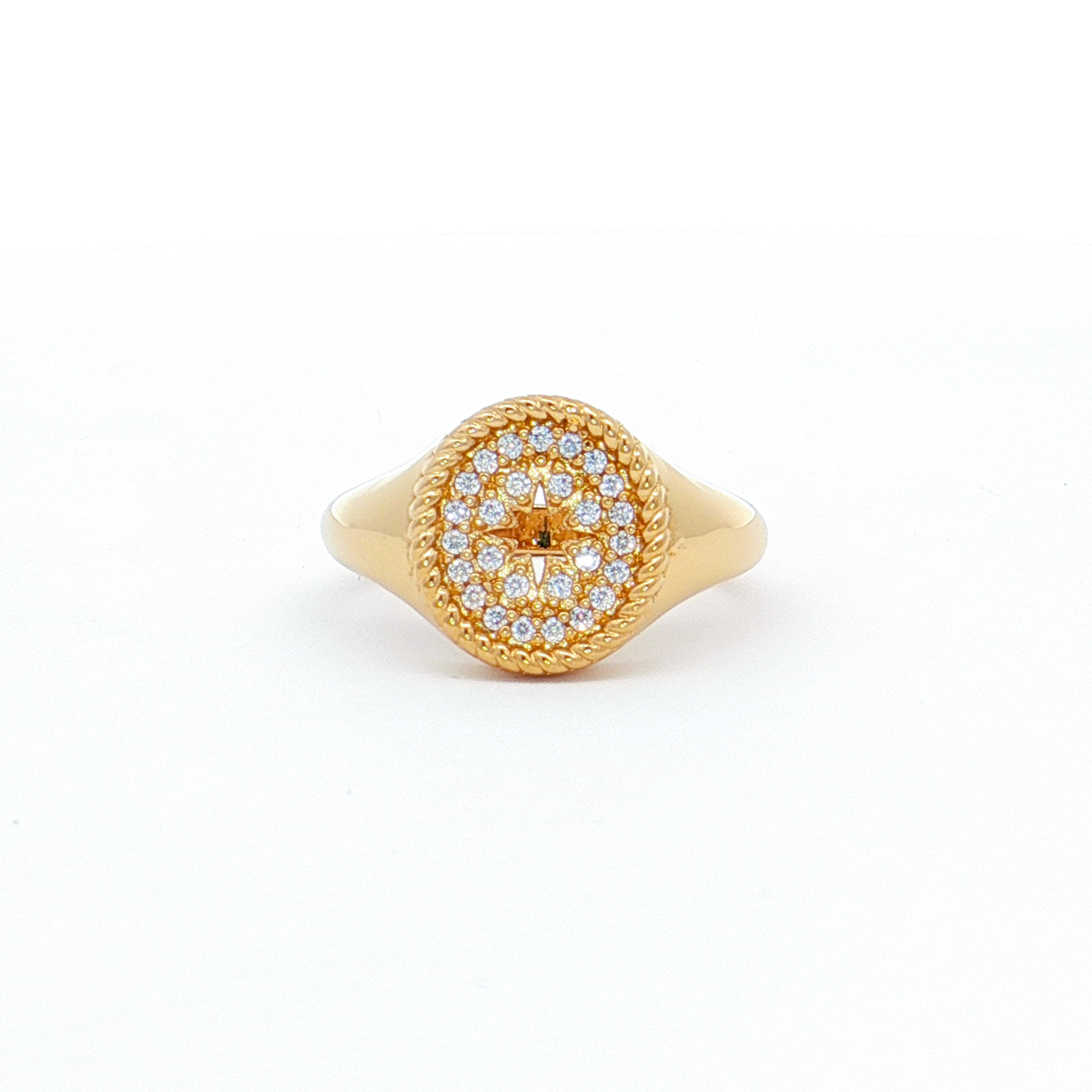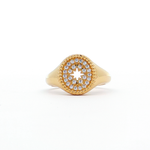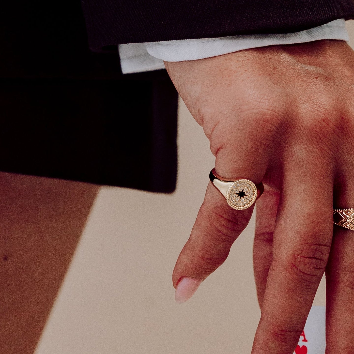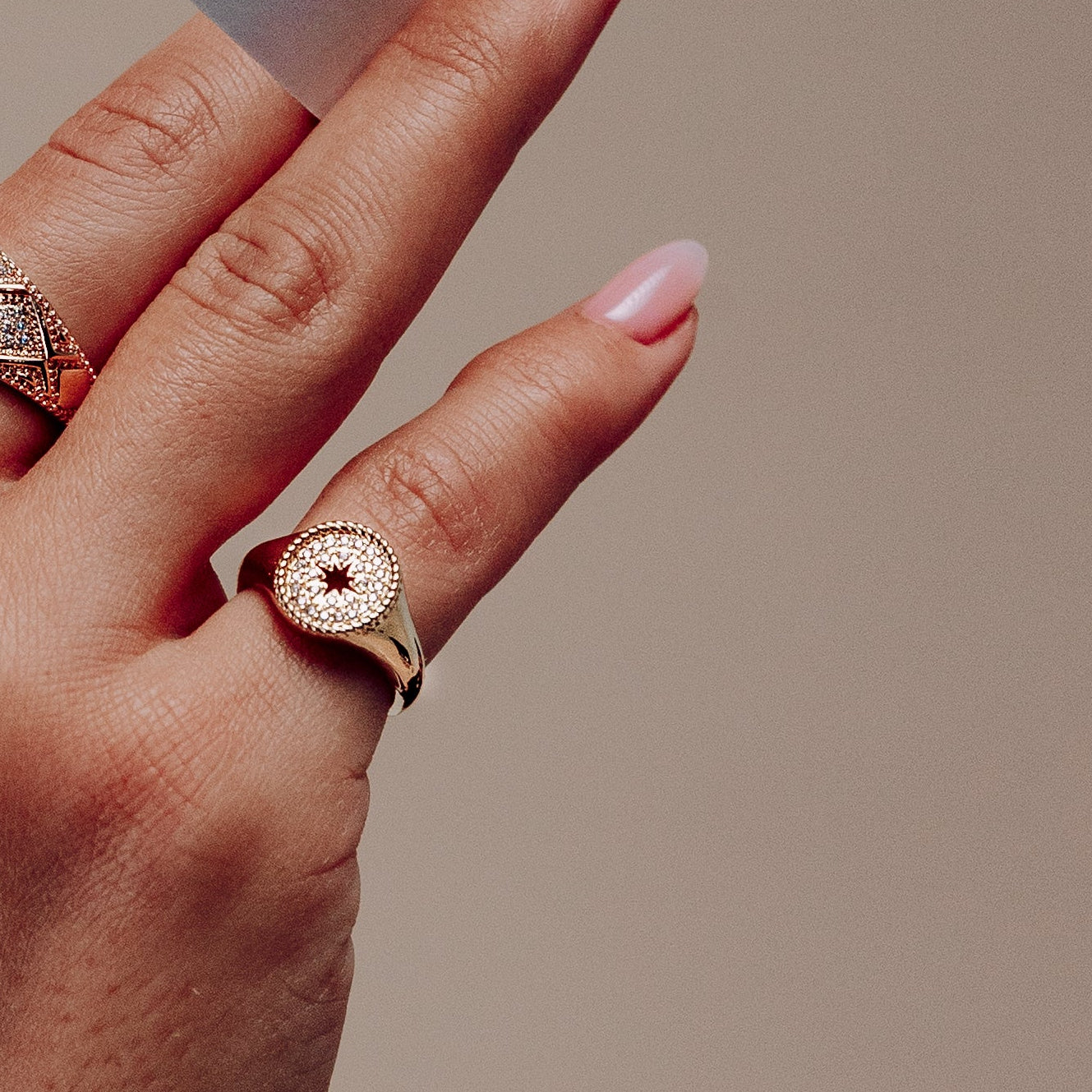 La bague Nikki en plaqué or 18 carats est une bague chevalière au style solaire. Son plateau ovale est orné d’un motif étoile pavé de zircons pour un éclat unique et féminin. Une pièce forte qui rappelle les chevalières de nos grands mères.
