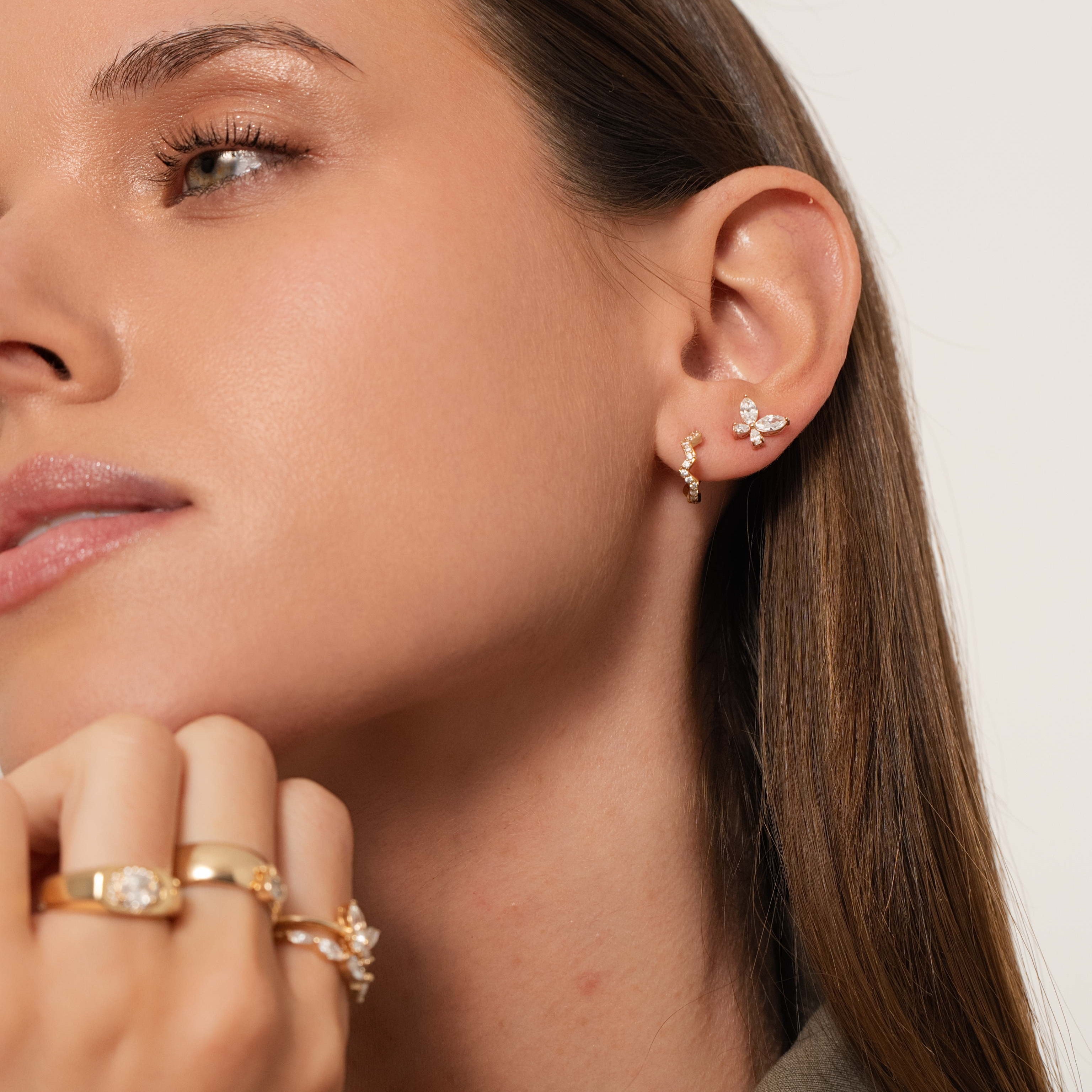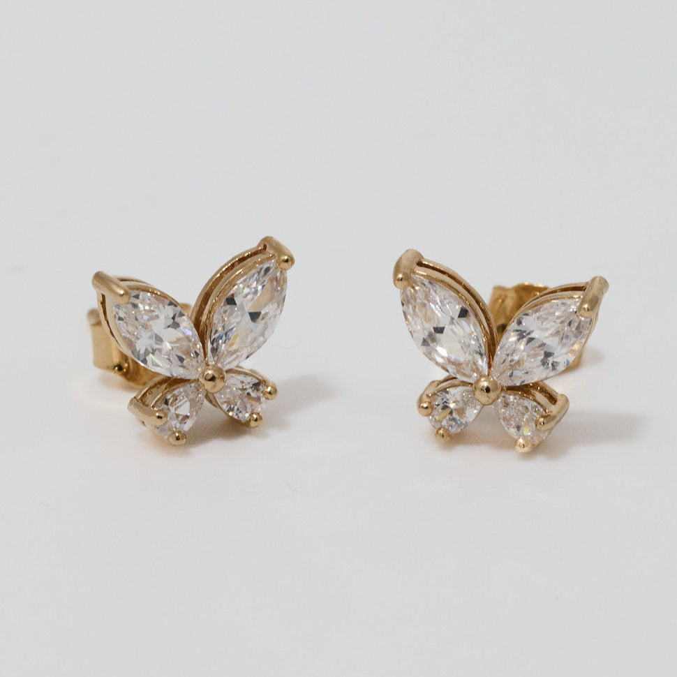 Les boucles d’oreilles Butterfly en plaqué or 18 carats sont en forme de papillon, composées de pierres brillantes taillées en forme de goutte. À la fois délicates et lumineuses, elles apportent une touche poétique à tous les looks.