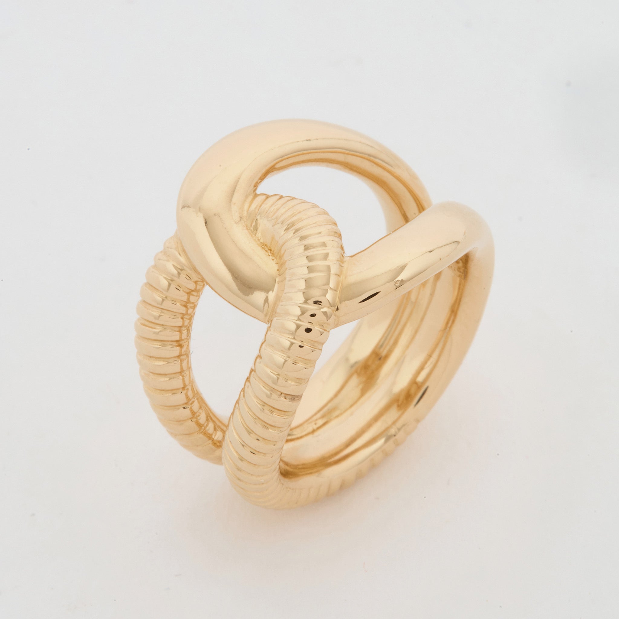 La bague Elena en plaqué or 18 carats se distingue par ses anneaux entrecroisés, alliant des textures lisses et finement rainurées.