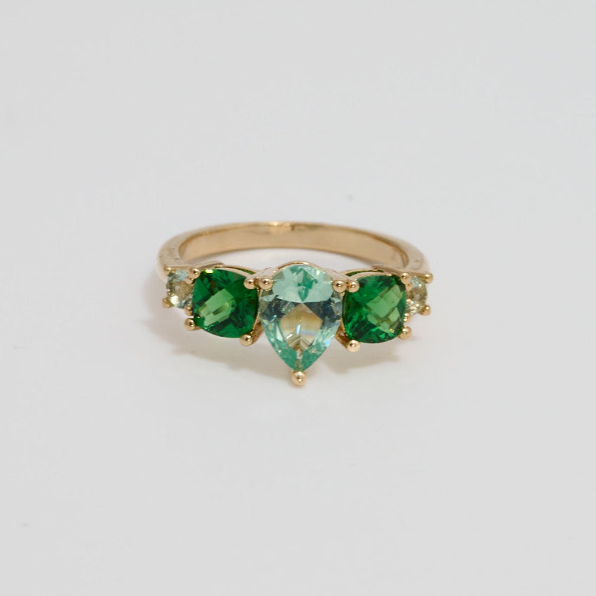 La bague Fleur en plaqué or 18 carats se distingue par l’alignement de ses pierres vertes aux tailles variées. Une création colorée et élégante à la silhouette à la fois moderne et vintage.