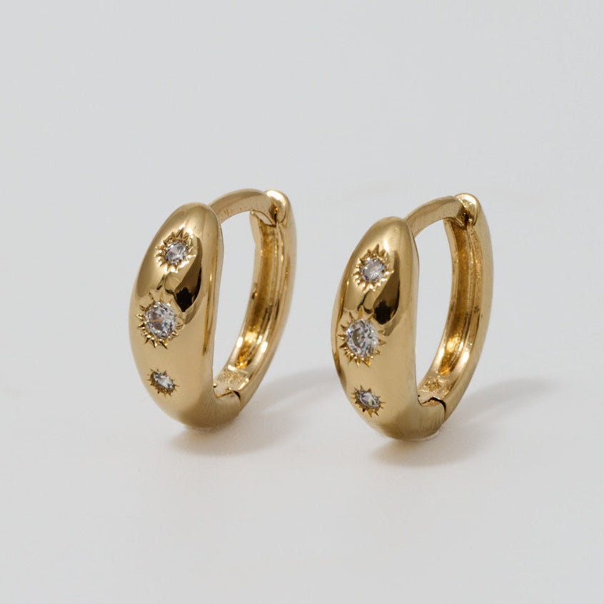 Les boucles d’oreilles Diva en plaqué or 18 carats sont de petits anneaux brillants décorés d’étoiles serties. Légères et lumineuses, elles apportent une touche de fantaisie discrète à toutes vos tenues.
