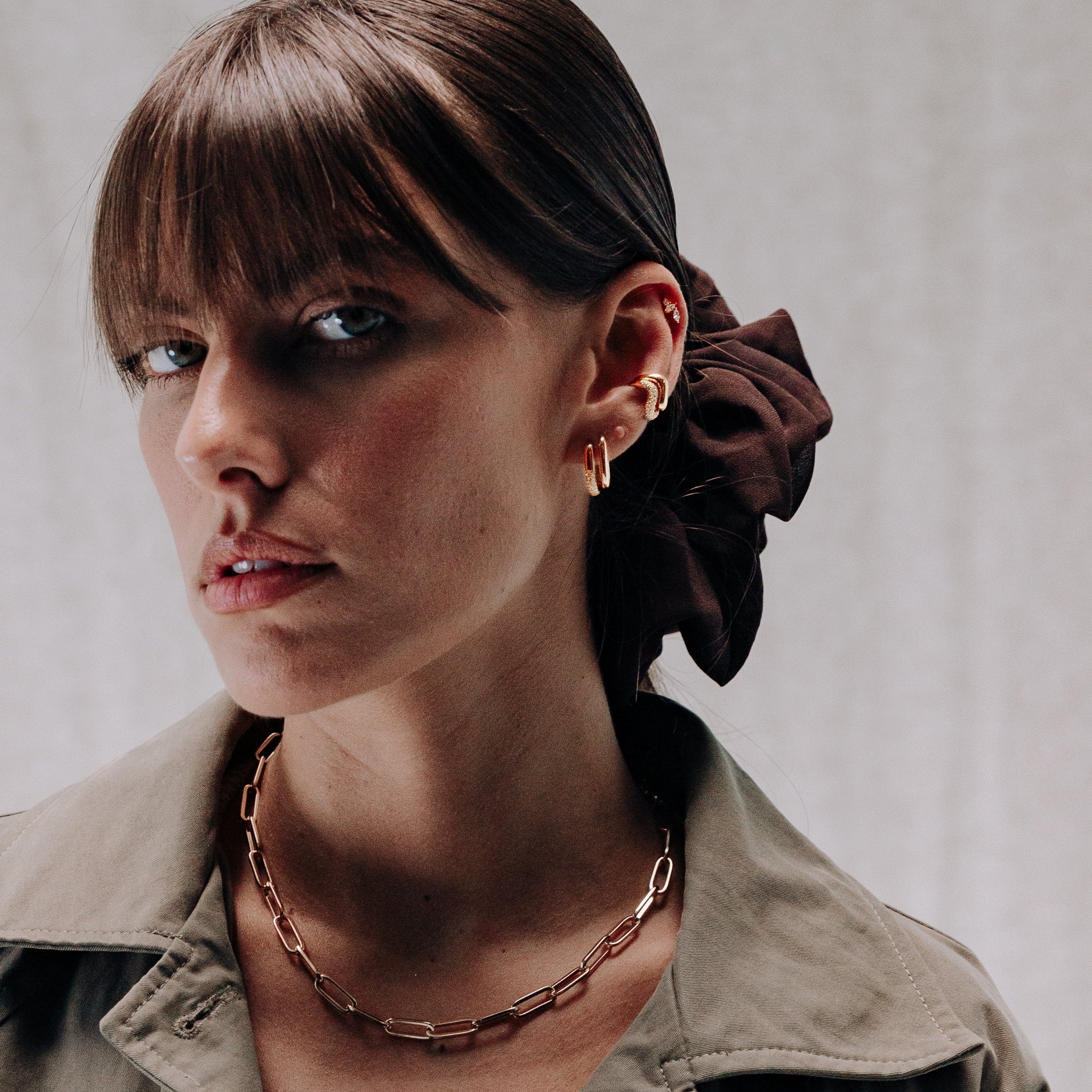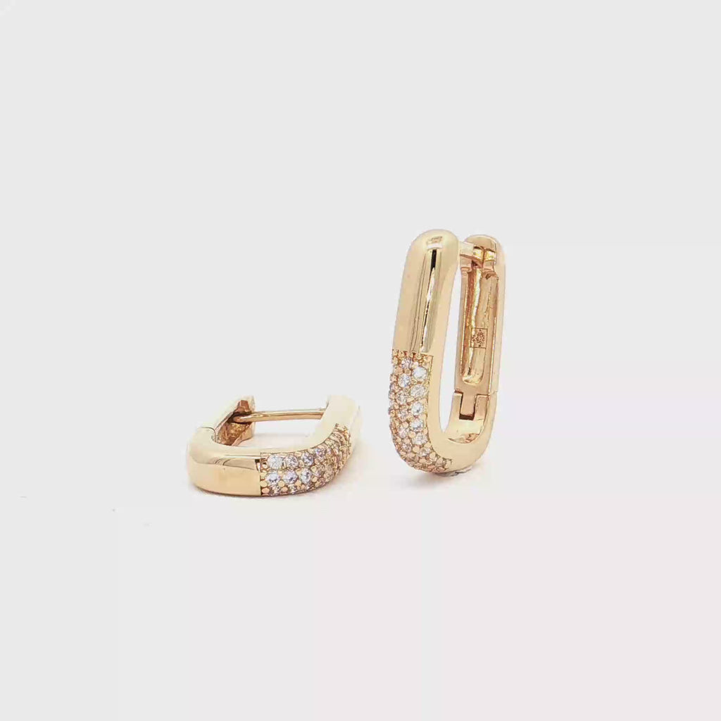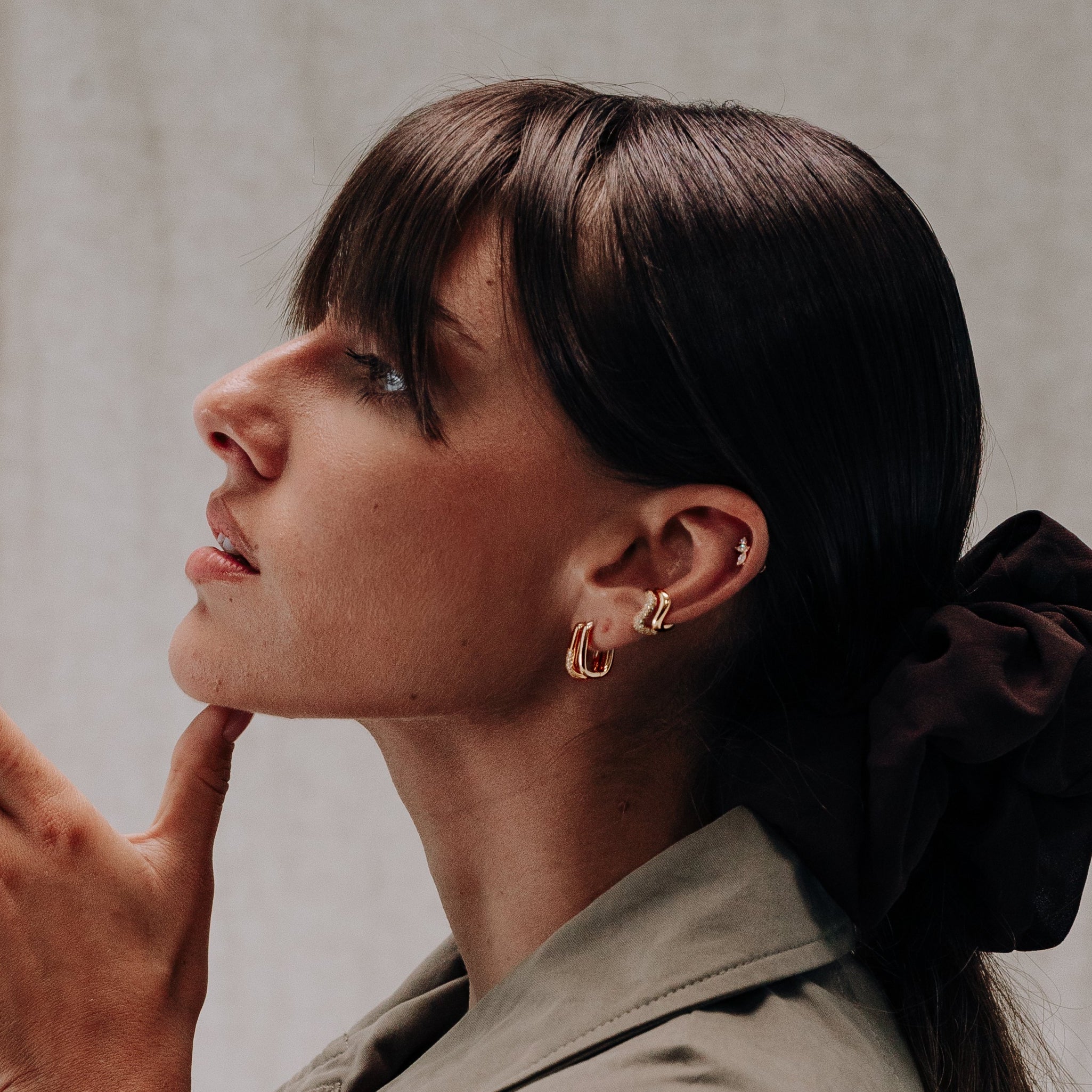 Les créoles Thalia rectangulaires en plaqué or 18 carats à moitié recouvertes de zirconiums sont parfaites à porter seules pour un effet sophistiqué, ou en duo avec la créole Lana pour une composition équilibrée.