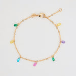 Le bracelet Pénélope en plaqué or 18 carats est une chaîne ornée de petites pampilles zirconiums multicolores. Le bracelet ajustable avec une chaîne de petits maillons s'attache avec un mousqueton. Il existe également le collier assorti.