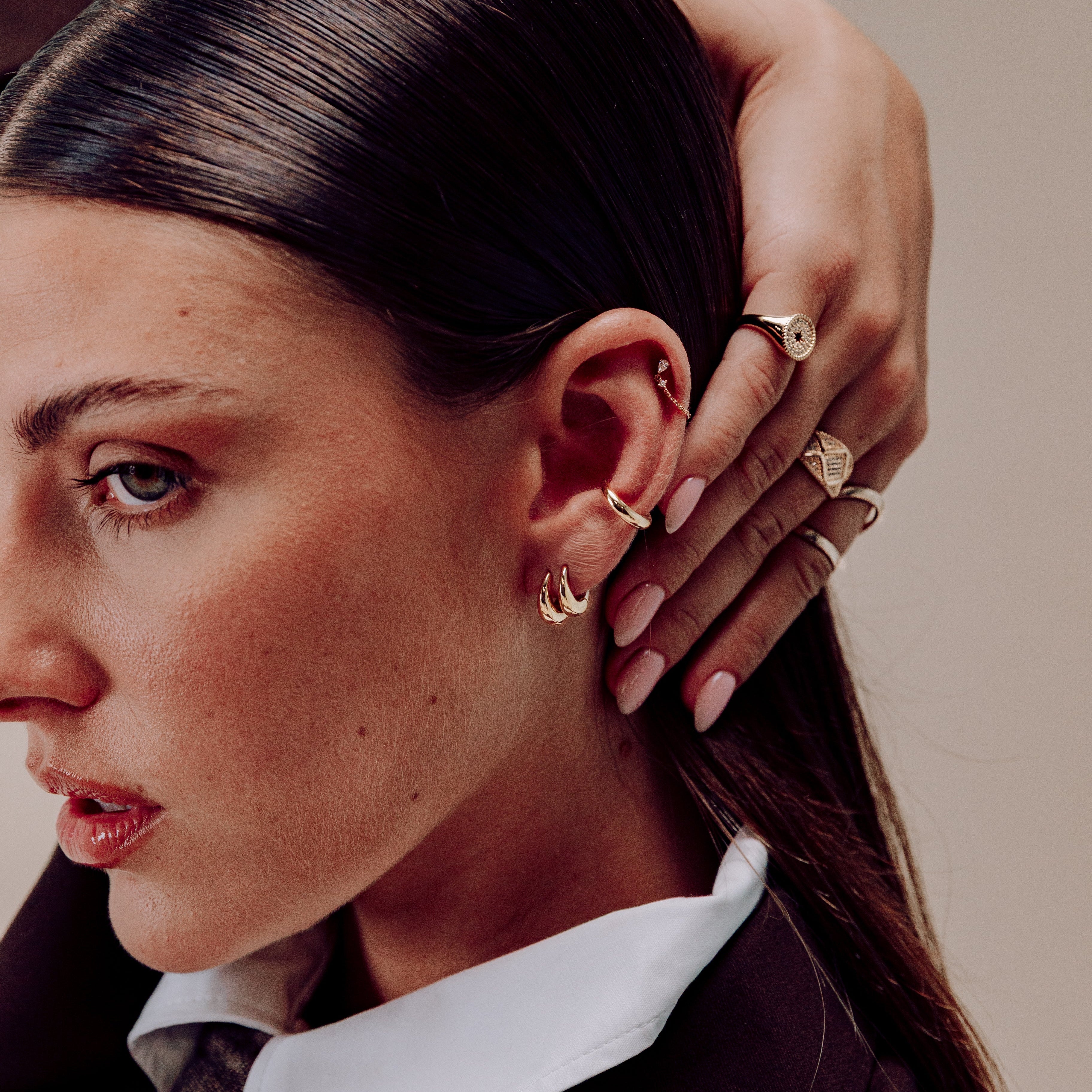 Le piercing Inès en plaqué or se distingue par son design délicat composé de deux zirconiums reliés par une fine chaîne. Ce bijou élégant crée un joli mouvement et apporte une touche lumineuse et moderne à l’oreille.